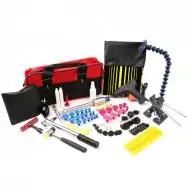 Wszystkie niezbędne elementy do wykonania napraw uszkodzonej karoserii: deska, pistolet na klej, wyciągacz wgnieceń i elementy do ich zlikwidowania. Z nim naprawisz uszkodzenia w prawie każdym miejscu w swoim aucie.