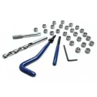 Skok gwintu: 1.25 Zastosowanie: Regeneracja zacisku hamulcowego itp.Zestaw zawiera: - 25 sztuk wymiennych wkładek - sprężyn gwintowanych. - wiertło HSS - gwintownik HSS - pokrętło - wybijak do usuwania zakończenia sprężyny służącego do jej wkręcania.
