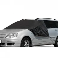 Osłona przeciwszronowa De Lux Medium Opis produktu: osłona przeciwszronowa zasłaniająca przednią oraz boczne szyby wraz z lusterkami wykonana z materiału odpornego na przymarzanie przeznaczona do samochodów osobowych odpowiednia do rozmiaru przedniej szyby (wysokość 100cm / szerokość 135-145cm) kolor czarny Zalety produktu: skutecznie chroni szyby przed osadzaniem się szronu, lodu i śniegu pozwala uniknąć porysowania oraz zaoszczędzić tracony czas podczas porannego zeskrobywania szyb mocowanie osłony poprzez przytrzaśnięcie drzwiami i zaczepienie haczykami do kół bardzo praktyczna i łatwa do założenia Pasuje na samochody typu: Audi A4, Toyota Auris, Seat Leon, Vw Passat