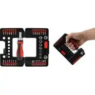 • W plastikowym organizerze,W zestawie:- 4 bity 1/4" krzyżakowe: PH0, PH1, PH2, PH3, - 4 bity 1/4" krzyżakowe: PZ0, PZ1, PZ2, PZ3, - 4 bity 1/4" płaskie: 3, 4, 5, 6 mm, - 6 bitów 1/4" Torx: T10, T15, T20, T25, T27, T30, - 5 bitów 1/4" imbus: 2, 3, 4, 5, 6 mm, - 4 bity 1/4" 4-kątne: 0, 1, 2, 3, - 9 nasadek 1/4": 4, 5, 6, 7, 8, 9, 10, 11, 12 mm, - pokrętło wkrętakowe z grzechotką, długość 125 mm.