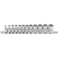 • nasadki wykonane ze stali chromowo wanadowej, • chromowane na mat, • 12-kątne, • długość 25 mm, • na plastikowej szynie,W zestawie:- 5/32", 3/16", 7/32",1/4", 9/32", 5/16", 11/32", 3/8", 7/16", 15/32", 1/2", 9/16".