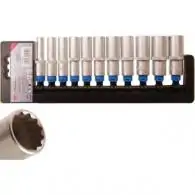 • 12-kątne, • Radełkowane, • Chromowane na mat, • Długość 63 mm, • W plastikowym uchwycie, • Stal chromowo wanadowa, • Wejście 3/8",W zestawie:- 8, 10, 11, 12, 13, 14, 15, 16, 17, 18, 19 mm.