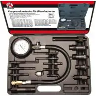 Przeznaczony do pomiaru stopnia sprężania w cylindrach silników wysokoprężnych z wtryskiem bezpośrednim i pośrednim. Miernik ciśnienia z podwójną podziałką bar i PSI wyposażony w zawór kontrolny do celów kontrolnych. Do silników samochodów osobowych. dostawczych i mniejszych samochodów ciężarowych,W zestawie:• Manometr o zakresie 0 - 70 bar / 0 - 1000 LB/SQ.IN o średnicy 80 mm, • Przewód elastyczny długości 400 mm wyposażony po obydwu stronach w metalową spiralę elastyczną co uniemożliwia przełamywanie się przewodu. Wąż zakończony jest ponadto funkcjonalnym szybkozłączem ułatwiającym wpinanie poszczególnych końcówek pomiarowych jak również zaworkiem uniemożliwiającym cofnięcie się wskazówki manometru przed zakończeniem pomiaru, • Końcówki - adaptery pomiarowe, • Końcówka gwint M10 x 1.25 - świeca żarowa - końcówka gwint M12 x 1.25 - świeca żarowa (Opel. Peugeot. Mercedes. VW. Ford. Seat. Fiat. Renault. Citroën. Peugeot. Land Rover), • Końcówka gwint M24 x 2 - wtryskiwacz (VW. Audi. Mercedes. Opel. Peugeot), • końcówka gwint M20 x 1.5 - wtryskiwacz, • Końcówka gwint M10 x 1 - świeca żarowa LAND ROVER, • Końcówka mocowana na jażmo - świeca żarowa STANADYNE, • końcówka mocowana na jażmo - wtryskiwacz DL, • Końcówka gwint M10 x 1.25 - świeca żarowa długa, • Końcówka pomiarowa M14 x 1.25 - świeca żarowa, • Belka pomocnicza do końcówek mocowanych przez jarzmo, • Adapter kolankowy z szybkozłączką, • Zasasowy zestaw uszczelek oraz zaworek,• Waga: 1800g,Instrukcja obsługi:WARUNKI BEZPIECZEŃSTWA:• Należy używać odpowiedniej odzieży ochronnej, • Przechowywać z daleka od dzieci oraz nigdy nie używać przyrządu w ich obecności, • Nie wolno modyfikować bądź też modernizować przyrządu lub jego wyposażenia, • Przyrząd może być używany jedynie przez wykwalifikowanych pracowników, • Pomieszczenie musi być wentylowane lub wyposażone w odsysacz spalin, • Podczas badania samochód unieruchomić hamulcem postojowym, • Uważać na gorące elementy silnika. używać odpowiedniej odzieży oraz okularów ochronnych, • Uważać na elementy wirujące. zwłaszcza na okresowo włączający się wentylator, • Obok samochodu powinna znajdować się gaśnica o odpowiedniej wielkości,POMIAR CIŚNIENIA SPRĘŻANIA• 1. Sprawdzić stan techniczny oraz naładowanie akumulatora, • 2. Sprawdzić. ewentualnie skorygować poziom oleju w silniku, • 3. Uruchomić silnik i poczekać aż osiągnie właściwą temperaturę pracy, • 4. Wyłączyć silnik, • 5. Wymontować z silnika wszystkie wtryskiwacze lub świece żarowe, • 6. Wybrać odpowiednią końcówkę pomiarową do danego silnika, • 7. Odłączyć dopływ paliwa do silnika (np. zawór magnetyczny), • 8. Uruchomić silnik rozrusznikiem na kilka sekund w celu usunięcia z komory sprężania resztek paliwa, • 9. W miejsce wtryskiwacza lub świecy żarowej wkręcić odpowiednią końcówkę zwracając uwagę na szczelność połączenia, • 10. Przy pomocy rozrusznika przekręcić wałem korbowym. aż do uzyskania w badanym cylindrze maksymalnego ciśnienia sprężania (jego wartość wskaże manometr), • 11. Po odczytaniu wskazanie należy skasować poprzez naciśnięcie przycisku zaworka kasującego, • 12. Postępować analogicznie z pozostałymi cylindrami,• Otrzymane wyniki pomiaru należy porównać z danymi fabrycznymi silnika,