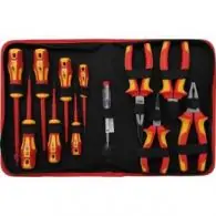 • stal chromowo wanadowa, • 2-komponentowe uchwyty antypoślizgowe, • izolowane zgodnie z DIN EN 60900, • wkrętaki z otworem do zawieszania, • w torbie zamykanej na zamek błyskawiczny,w zestawie:- tester napięcia, 120-250V, długość ostrza 140 mm (B.725), - wkrętak płaski 3 x 75 mm (B.4925), - wkrętak płaski 4 x 100 mm (B.4924), - wkrętak płaski 5,5 x 125 mm (B.4940), - wkrętak płaski 6,5 x 150 mm (B.4941), - wkrętak krzyżakowy PH0 x 75 mm (B.4942), - wkrętak krzyżakowy PH1 x 80 mm (B.4926), - wkrętak krzyżakowy PH2 x 100 mm (B.4927), - szczypce uniwersalne 180 mm (B.7150), - obcinaczki boczne 160 mm (B.7154), - szczypce płaskie 160 mm (B.7151), - szczypce płaski 200 mm (B.7152),