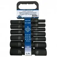 Nowy zestaw nasadek AD-13DW zastępuje zestaw AD-13D. Nowy zestaw zawiera 13 sztuk długich nasadek udarowych w najbardziej popularnych rozmiarach umieszczonych na wieszaku. W odpowiedzi na sygnały od Państwa zmieniliśmy dobór rozmiarów nasadek w nowym zestawie. Zamiast rozmiarów 11, 12, 16 mm występują rozmiary 15, 18 i 32 mm.