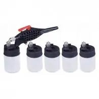 W zestawie z aerografem znajduje się 5 zbiorniczków o pojemności 22ml każdy, przewód z tworzywa do podłączenia sprężonego powietrza, oraz redukcja M5x0,5 x 1/4"W .